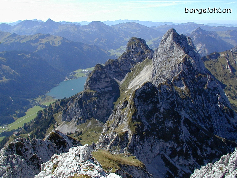 Vom Gaishorn aus bietet sich dieser tolle Blick auf die Tannheimer Berge im Hintergrund. Im Vordergrund liegt der idyllische Vilsalpsee.